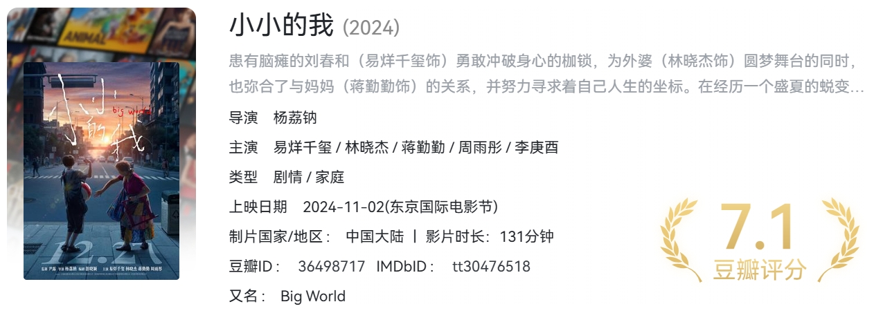 小小的我(2024)正式版 易烊千玺【4K HQ 高码率 60帧率版】【DTS5.1环绕声】国语中字【24.2G】 栏目:电影区 作者:资源坊 时间:2026-03-04 08:47:52   **剧情简介:** 患有脑瘫的刘春和(易烊千玺饰)勇敢冲破身心的枷锁,为外婆(林晓杰饰)圆梦舞台的同时,也弥合了与妈妈(蒋勤勤饰)的关系,并努力寻求着自己人生的坐标。在经历一个盛夏的蜕变后,他终于踏上了新的旅程。 > [!success] **资源链接** >https://pan.quark.cn/s/2bedabf191c0 版权声明:本站不存储任何实质资源,该帖为发布的网盘链接介绍帖。如您认为本站任何介绍帖侵犯了您的合法版权,请联系站长 ( 微信:tess9933 ) 进行投诉,我们将在确认本文链接指向的资源存在侵权后,立即删除相关介绍帖子!
