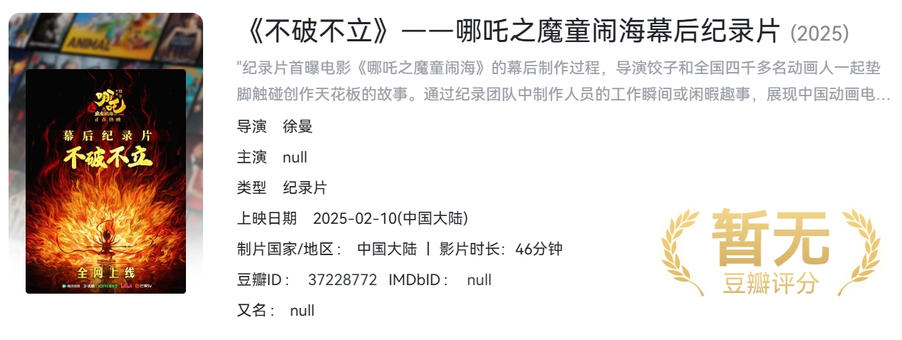 【不破不立—哪吒之魔童闹海幕后纪录片】(2025)【4K】简中字幕 【2.6G】 栏目:纪录片 作者:资源坊 时间:2026-02-01 05:59:58   **剧情简介:** 纪录片首曝电影《哪吒之魔童闹海》的幕后制作过程,导演饺子和全国四千多名动画人一起垫脚触碰创作天花板的故事。通过纪录团队中制作人员的工作瞬间或闲暇趣事,展现中国动画电影人不断突破想象力、突破自我、突破极限的顽"强精神与乐观态度,及"人生不设限"的价值观。 > [!success] **资源链接** > https://pan.quark.cn/s/497bb3d88167 版权声明:本站不存储任何实质资源,该帖为发布的网盘链接介绍帖。如您认为本站任何介绍帖侵犯了您的合法版权,请联系站长 ( 微信:tess9933 ) 进行投诉,我们将在确认本文链接指向的资源存在侵权后,立即删除相关介绍帖子!