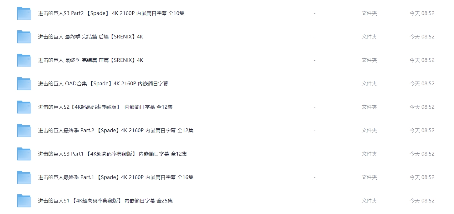 《进击的巨人》全系列完结【顶级4K典藏版】 4K超高码率 单集8G 附OVA合集 【内嵌简日双语特效字幕】 814G 栏目:动漫区 作者:资源坊 时间:2025-01-03 08:56:26    **简介:** 《进击的巨人》(日语:進撃の巨人)是一部日本的黑暗奇幻动画连续剧,改编自漫画家谏山创的同名漫画。 故事发生在虚构世界,人们生活在由三道层层包围的巨大围墙所构成的世界中,围墙外面有着无数以人类为食的巨人。故事围绕着主人公艾伦·耶格尔和他的朋友三笠·阿克曼以及阿尔敏·阿诺德的经历展开。三人原本平静的生活因某日巨人破墙而入而随之改变,之后经历苦难的他们加入了专门对付墙外巨人的调查兵团。艾伦和他的朋友们发誓要将这世界上的巨人赶尽杀绝,并在之后的历练中成长为与巨人作战的精锐士兵。然而随着艾伦被发现也是巨人之一后,这个世界背后的真相被一点点揭开。故事的主题也由最初的热血复仇逐渐变成对世间的人性和正义的复杂解读。 本作在剧情、作画与配乐各方面出色的表现,使其在日本国内与海外的众多影视评论网站上获得接近满分的评价,**被认为是近年日本动画的代表作之一**。 > [!success] **资源链接** > [https://pan.quark.cn/s/979f716b3125](https://pan.quark.cn/s/979f716b3125 "https://pan.quark.cn/s/979f716b3125") 版权声明:本站不存储任何实质资源,该帖为发布的网盘链接介绍帖。如您认为本站任何介绍帖侵犯了您的合法版权,请联系站长 ( 微信:tess9933 ) 进行投诉,我们将在确认本文链接指向的资源存在侵权后,立即删除相关介绍帖子!