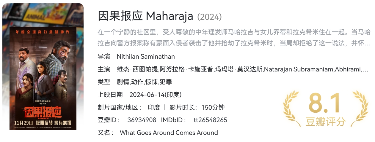 因果报应(2024)【NF / 4K / SDR / 高码率】【杜比5.1音效】【简英特效字幕】【印度高分电影】【16.4G】 栏目:电影区 作者:资源坊 时间:2026-03-05 08:59:43    **简介:** 在一个宁静的社区里,受人尊敬的中年理发师马哈拉吉与女儿乔蒂和拉克希米住在一起。当马哈拉吉向警方报案称有蒙面入侵者袭击了他并抢劫了拉克希米时,当局却拒绝了这一说法,并怀疑她所失财物的真实性。尽管他多次试图寻求帮助,但他还是不惜一切代价,甚至在女儿回来之前亲自调查。随着疑点越来越多,大君的理智受到质疑,谜团也越来越深。 > [!success] **资源链接** > https://pan.quark.cn/s/2428712e34f5 版权声明:本站不存储任何实质资源,该帖为发布的网盘链接介绍帖。如您认为本站任何介绍帖侵犯了您的合法版权,请联系站长 ( 微信:tess9933 ) 进行投诉,我们将在确认本文链接指向的资源存在侵权后,立即删除相关介绍帖子!